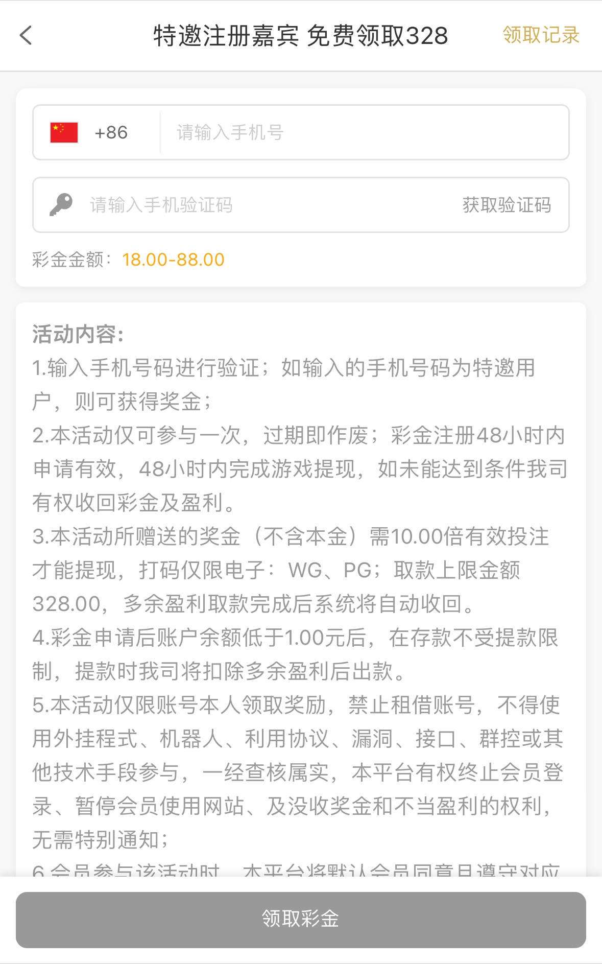 特邀碰瓷,优惠里自助领取,10倍流水,限WG/PG,取款上限328